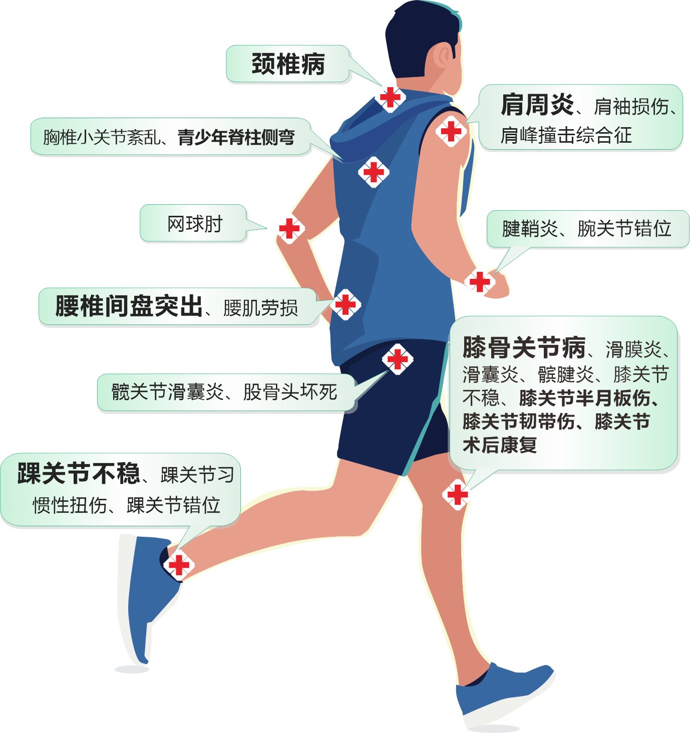 武医特色诊疗技术,如:武医护膝术、半月板复位术及踝关节复位术等,以“武医宗师”郑怀贤教授的中医运动医学技术和中医药为根基,融合了现代运动医学技术和理念。运动医学康复门诊,以国家运动队的医疗康复保障体系为基础,接诊了近万民众。为每位客户量身定制康复方案,帮助解决常见运动损伤及各类骨关节疾病。