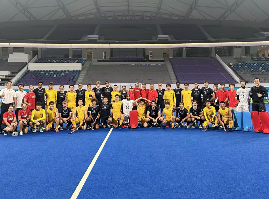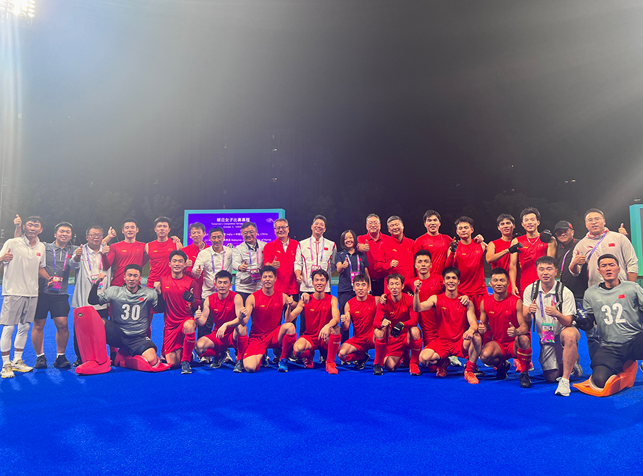 康复师胡振宇保障国家男子曲棍球队在第19届杭州亚运会赛场合影